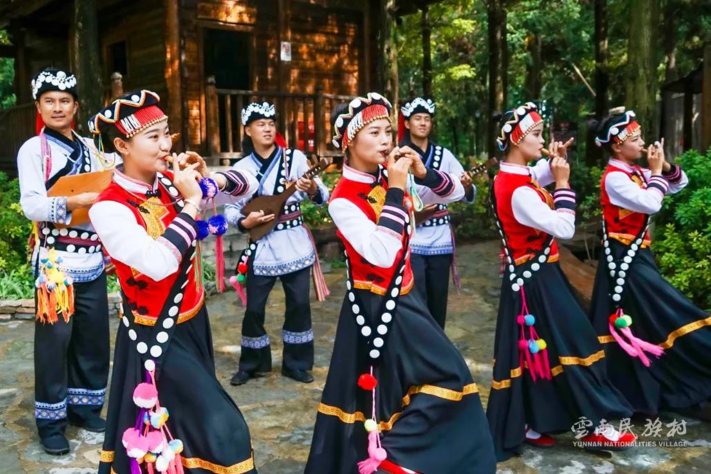 彝族在云南境內(nèi)約471萬(wàn)人,是省內(nèi)人口最多、分布最廣的少數(shù)民族,主要聚居在金沙江、元江流域和哀牢山、無(wú)量山腹地。彝族是一個(gè)能歌善舞的民族,民間打歌、跳樂(lè)之風(fēng)盛行,大三弦、跌腳舞久負(fù)盛名?;鸢压?jié)是彝族最具特色的民族節(jié)日。彝族村占地50余畝,三虎浮雕墻與虎頭內(nèi)祖師形象表現(xiàn)了彝族虎鷹文化。太陽(yáng)歷廣場(chǎng)圖騰柱上有太陽(yáng)、虎、火和八卦圖形象,周?chē)h(huán)繞著10個(gè)朝向不同的月球造型,外圓周有12生肖石雕。依山而建的“...
